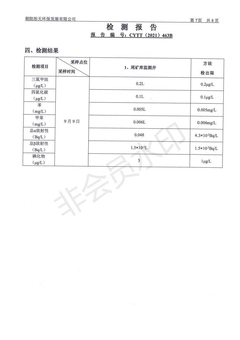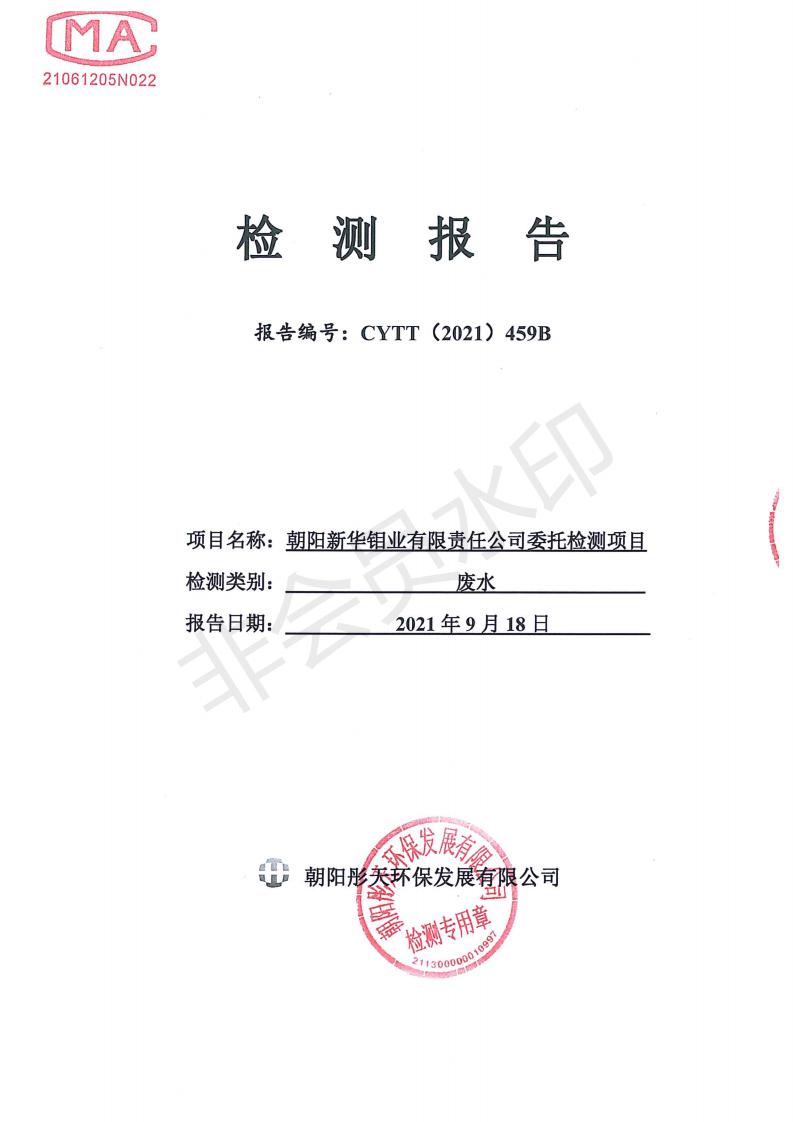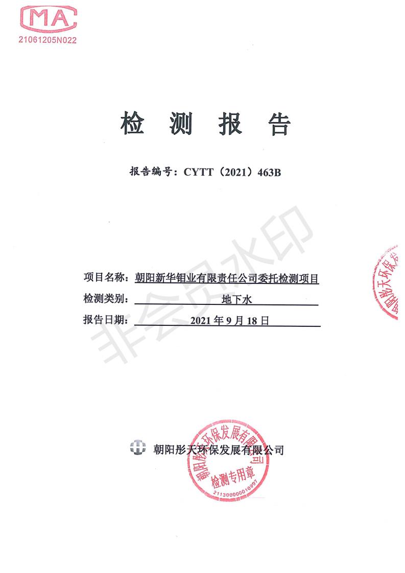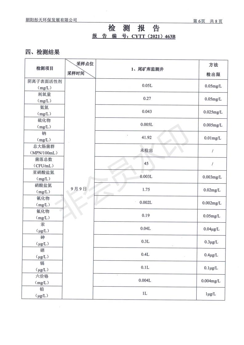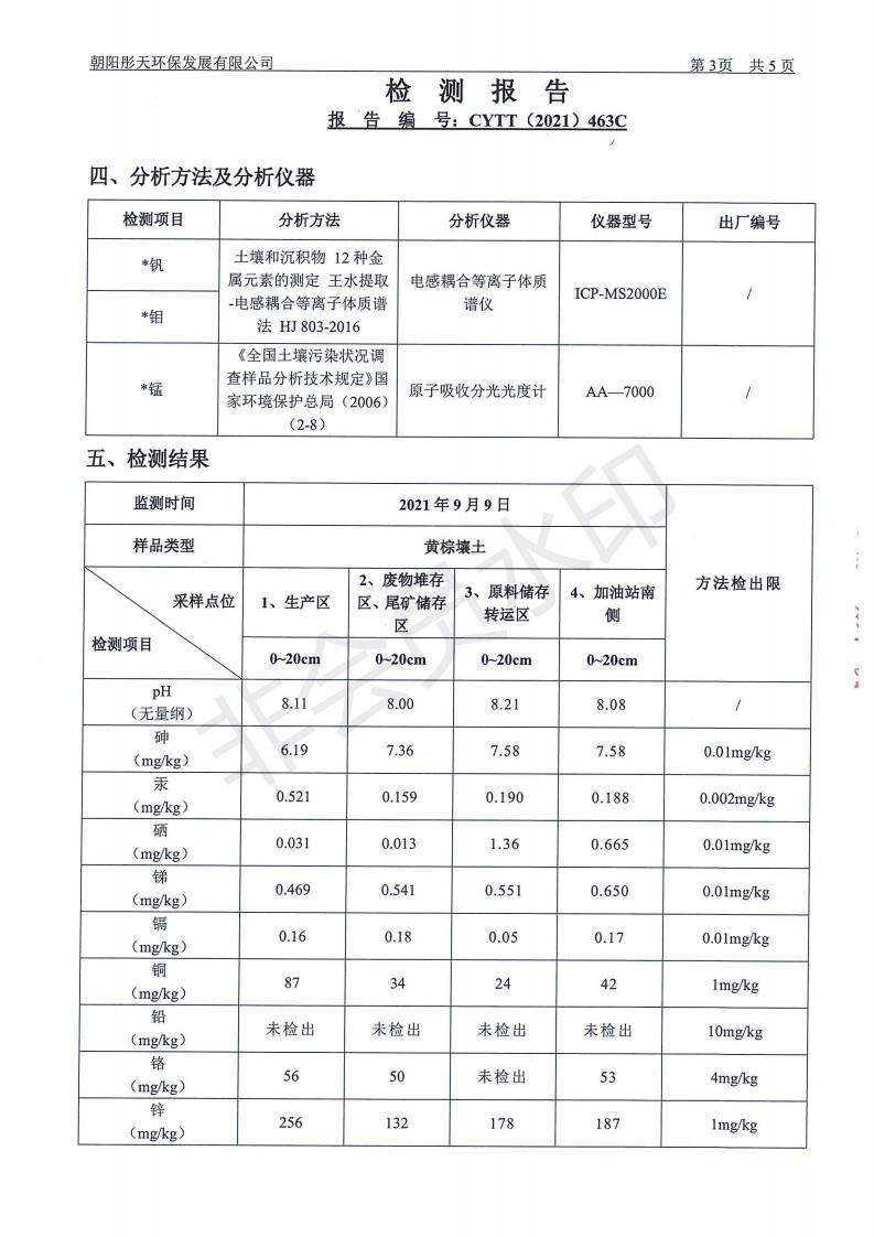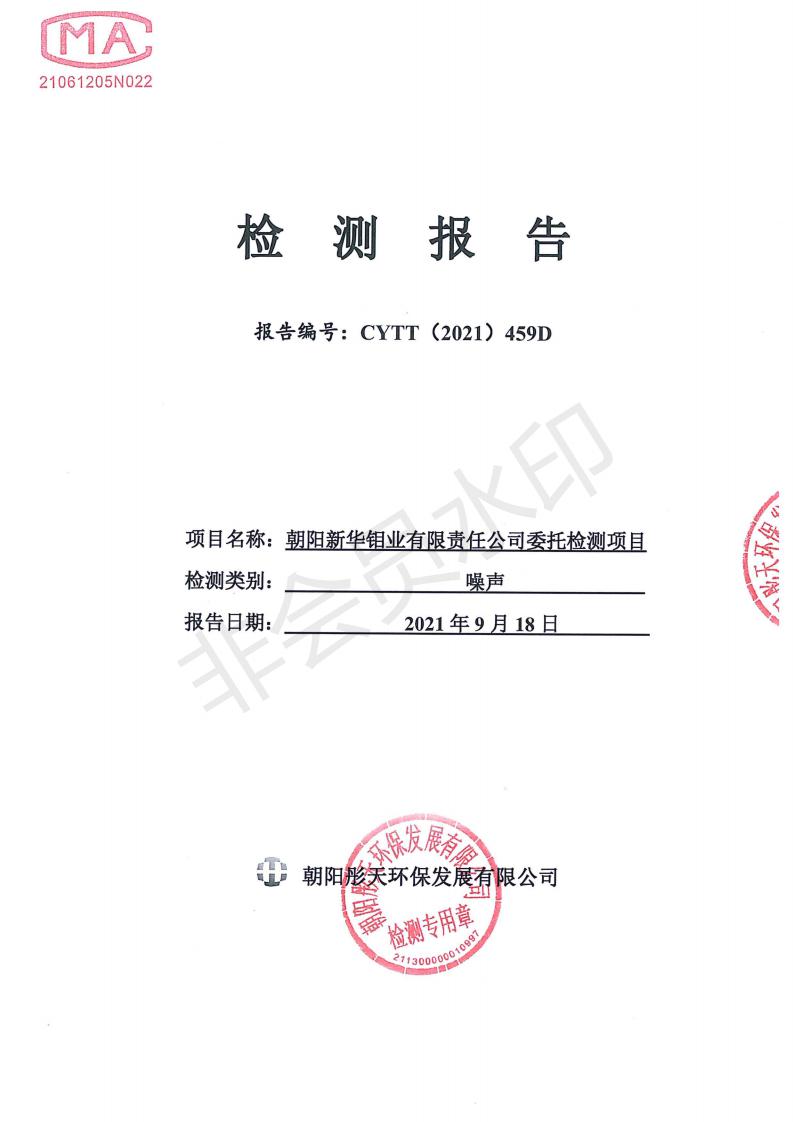 按照《环境检测方案》的相关要求,我公司2021年三季度委托朝阳彤天环保发展有限公司按相关规范对矿区内水、废水、噪声、环境空气和废气进行了检测,现将检测结果发布予以公示。