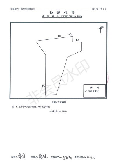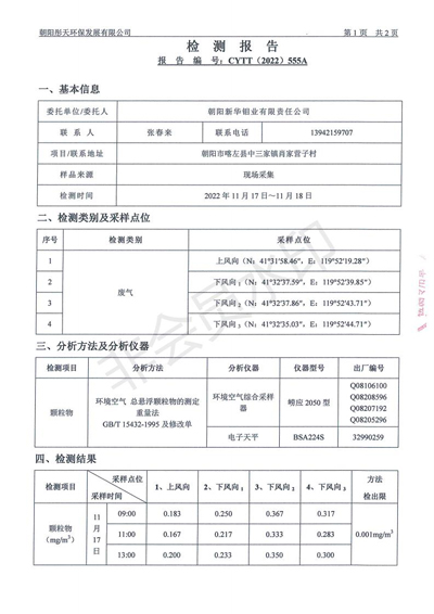 按照《环境检测方案》的相关要求,我公司2022年四季度委托朝阳彤天环保发展有限公司按相关规范对矿区废气进行了检测,现将检测结果发布予以公示。