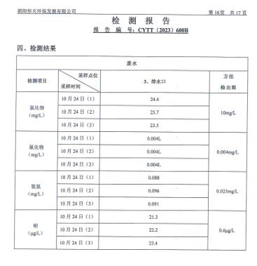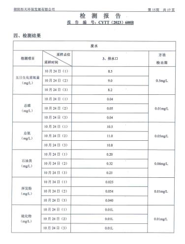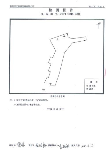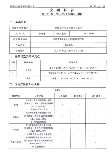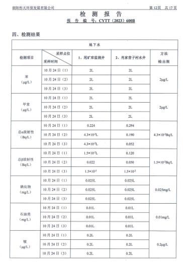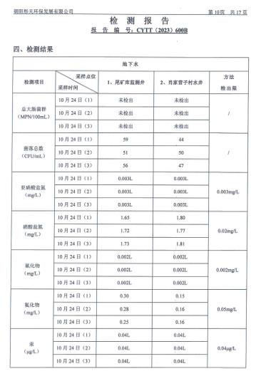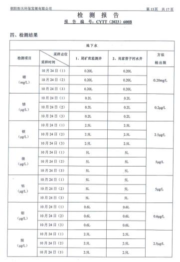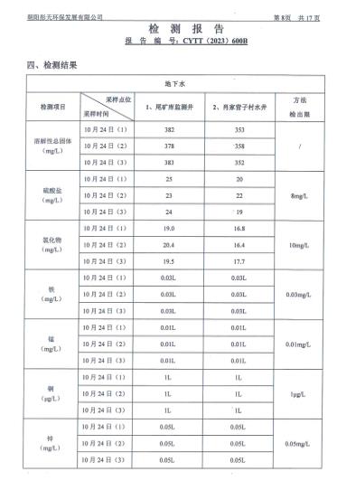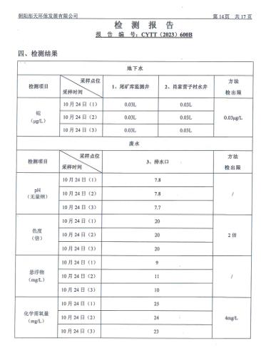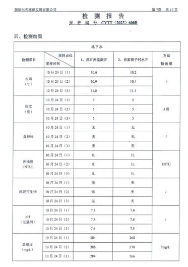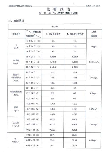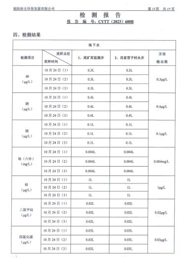按照《环境检测方案》的相关要求,我公司2023年四季度委托朝阳彤天环保发展有限公司按相关规范对矿区地下水、废水进行了检测,现将检测结果发布予以公示。