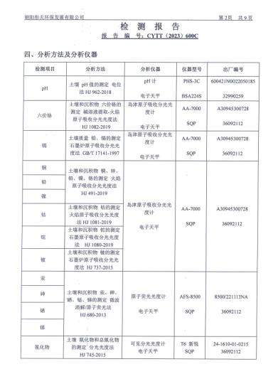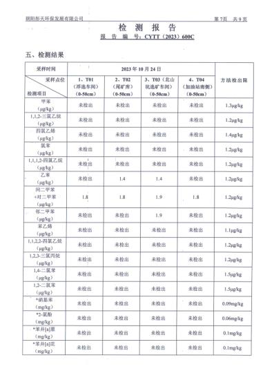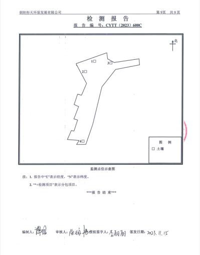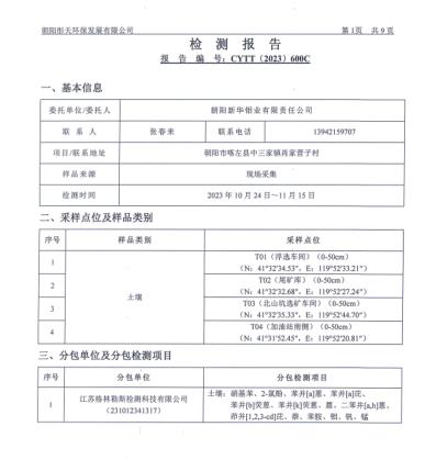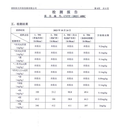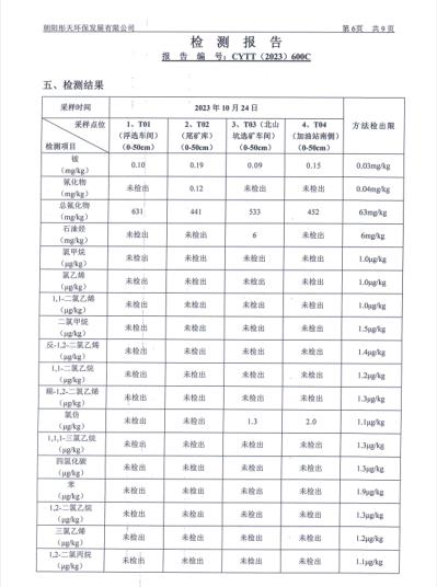 按照《环境检测方案》的相关要求,我公司2023年四季度委托朝阳彤天环保发展有限公司按相关规范对矿区土壤进行了检测,现将检测结果发布予以公示。