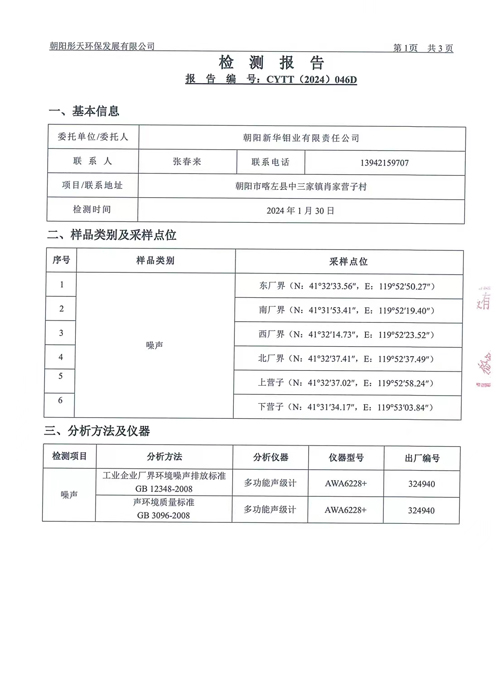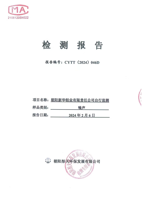 新华钼业2024年一季度噪声检测公示