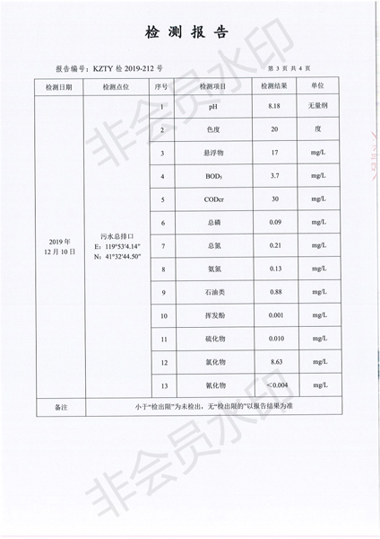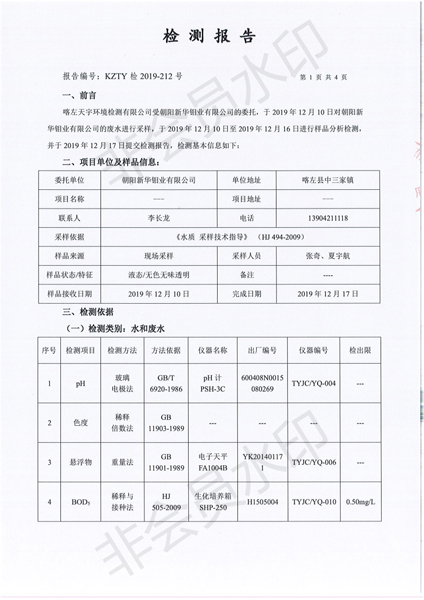 按照《污水监测方案》的相关要求,我公司委托喀左天宇环境检测有限公司按相关规范对矿区内废水进行了监测,现将监测结果发布予以公示。