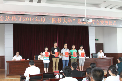 2014年8月20日,金达集团圆梦大学助学金发放仪式在喀左县教育局圆满举行,集团常务副总经理李凤海、人力资源部副主任曹云军、新华工会副主席郭涛代表金达集团将16.2万元助学金带给了40名优秀贫困学子,