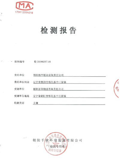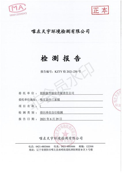 朝阳新华钼业有限责任公司环境检测公示 按照《环境检测方案》的相关要求,我公司2021年二季度委托喀左天宇环境检测有限